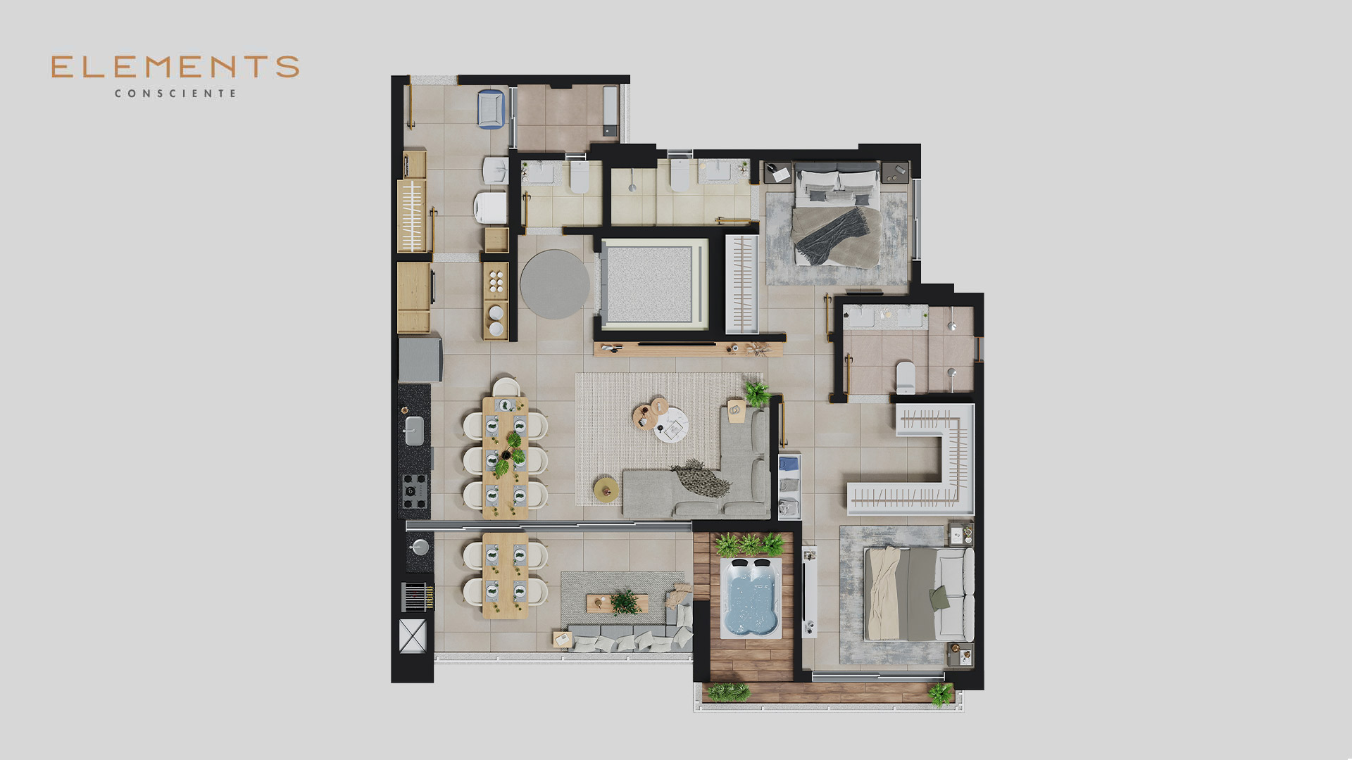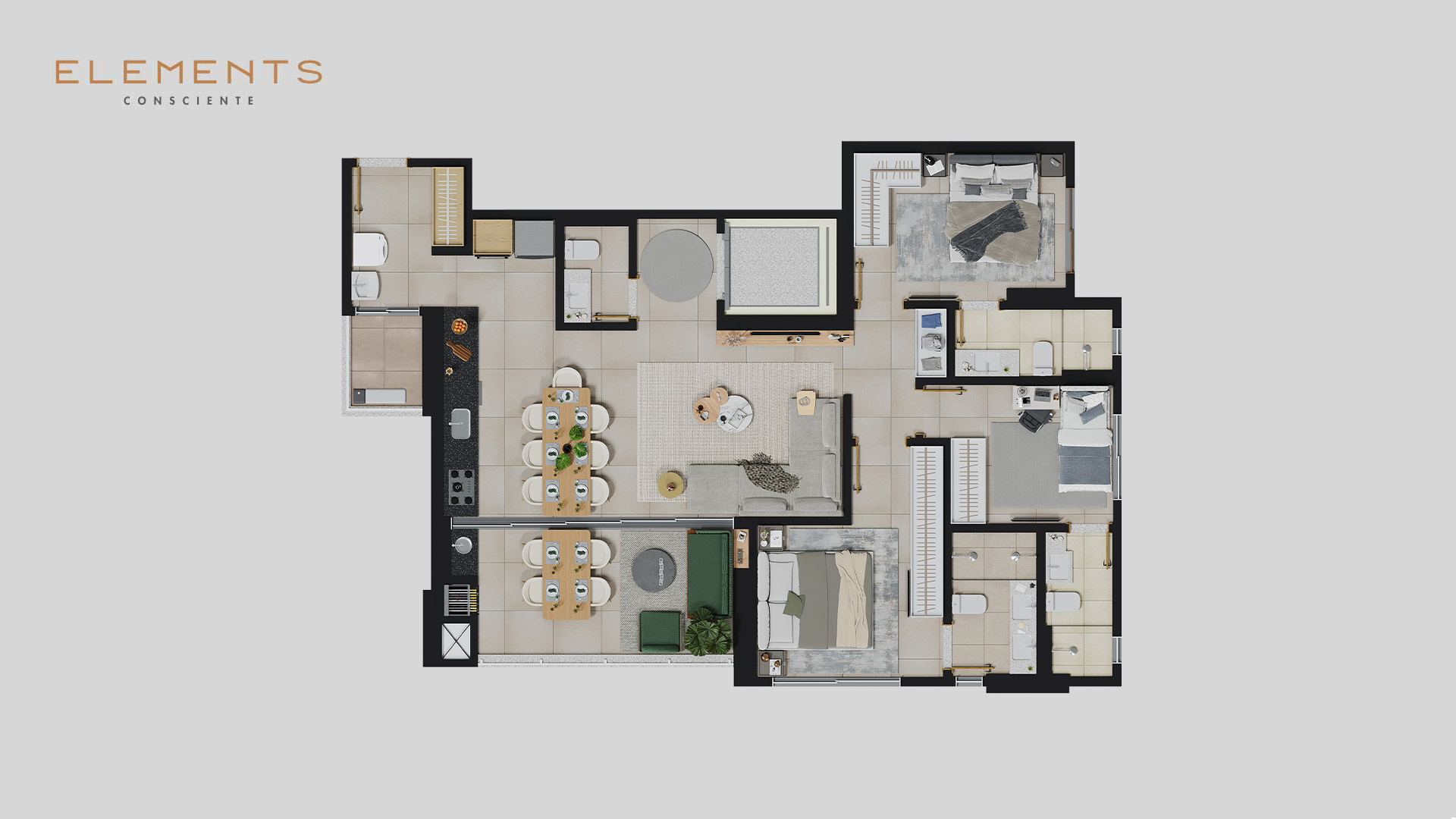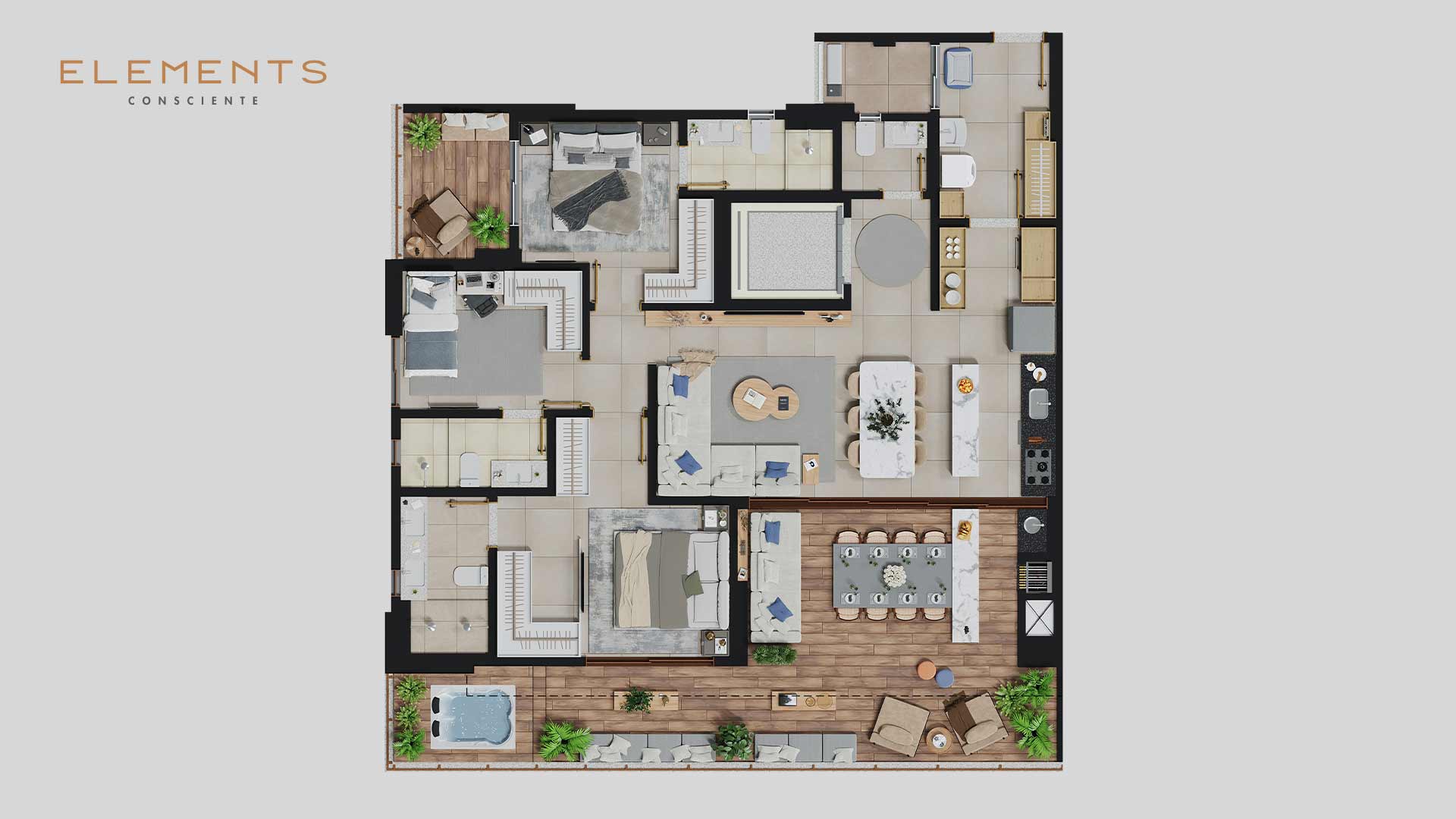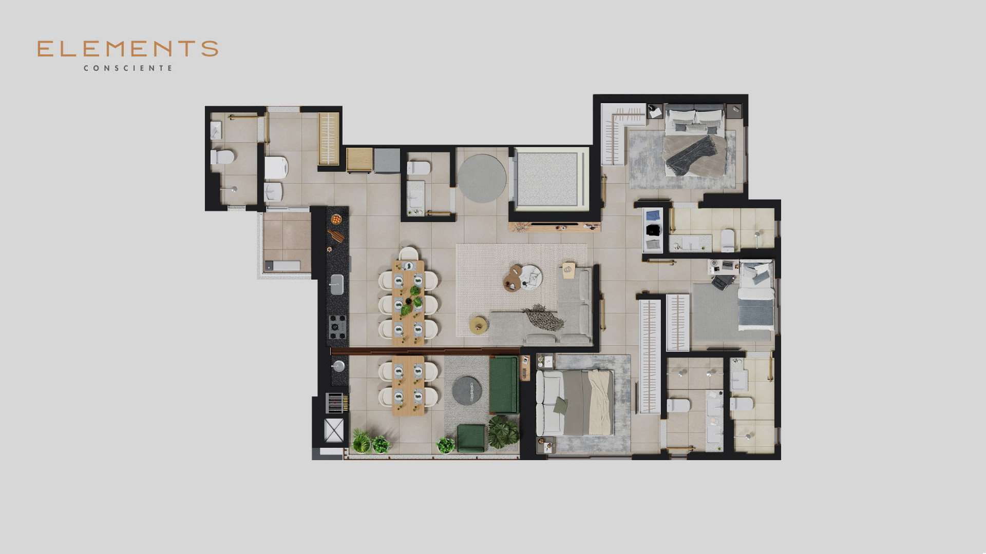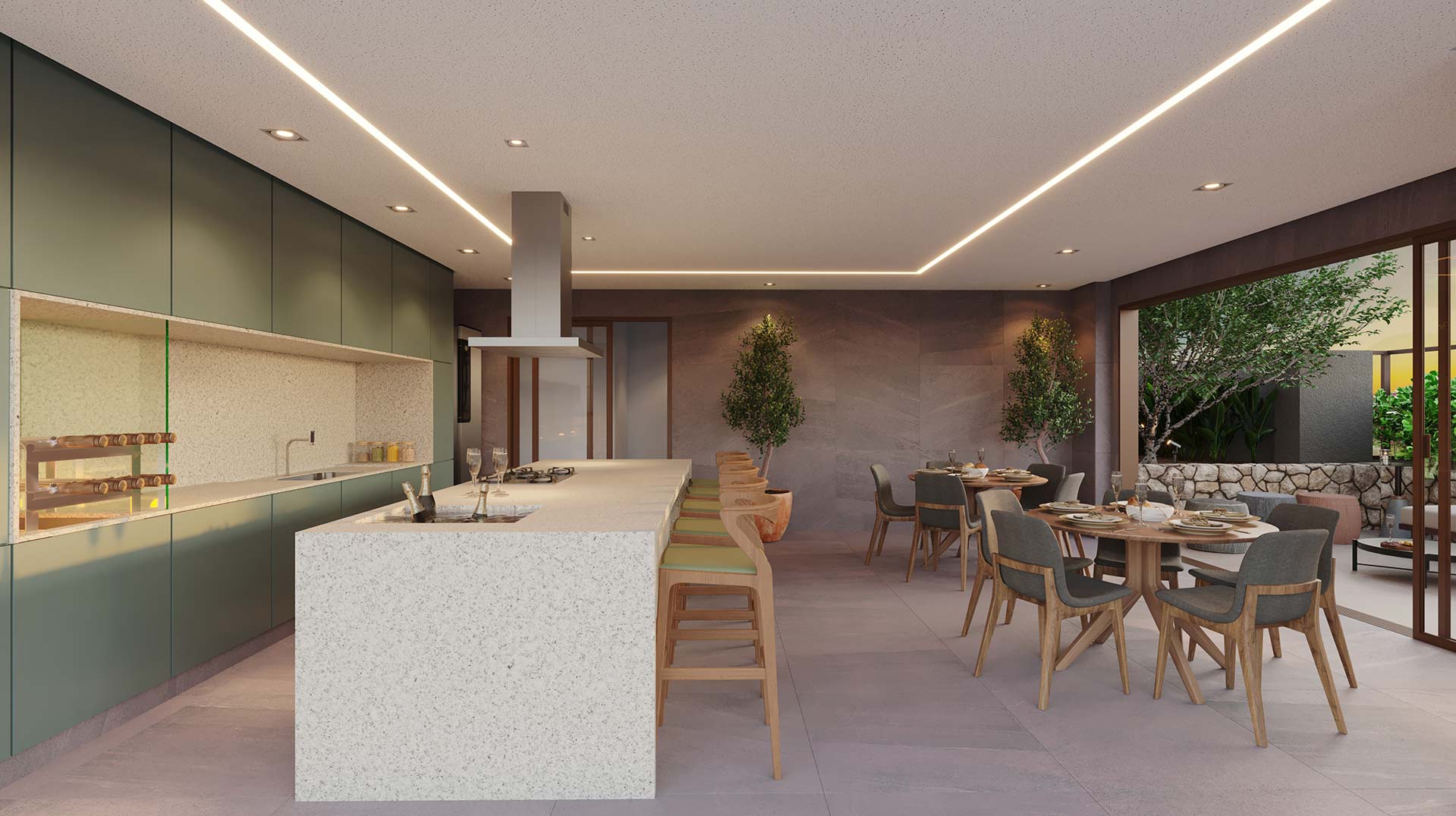 Arquitetura inteligente, rica em personalidade e alto padrão de detalhamento em todos os espaços. Sofisticação que se converte em conforto, funcionalidade e bem-estar. O padrão Consciente em cada detalhe.